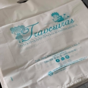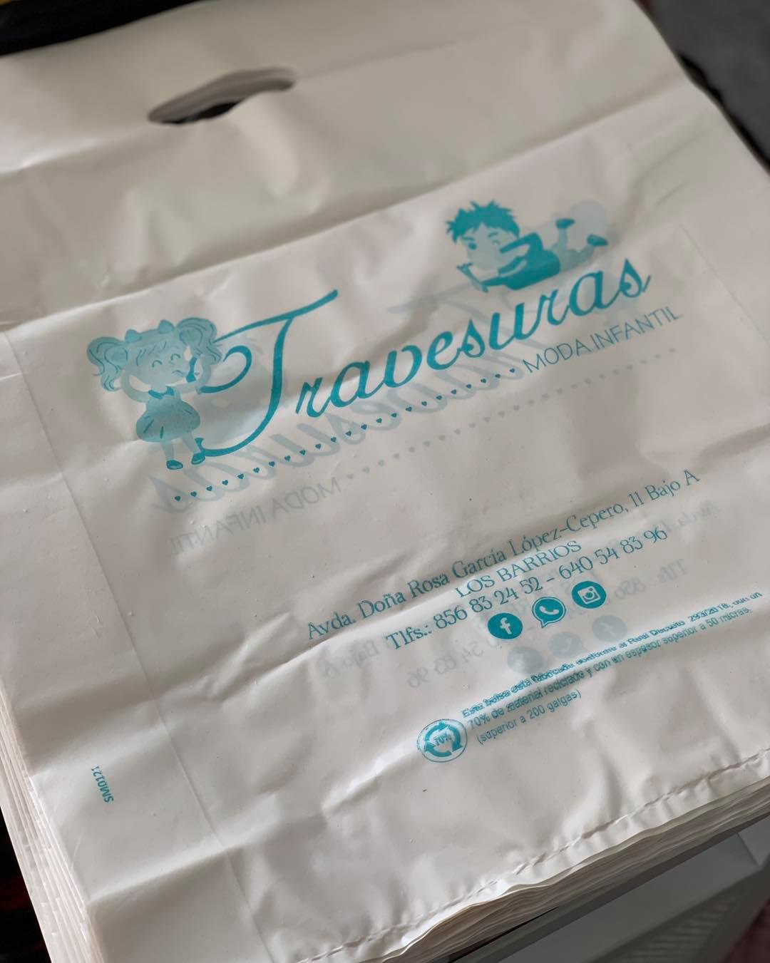 Hemos creado esta bolsa para la tienda de moda infantil “Travesuras”, fabricada con un 70% de material reciclado y con un espesor superior a 50 micras.