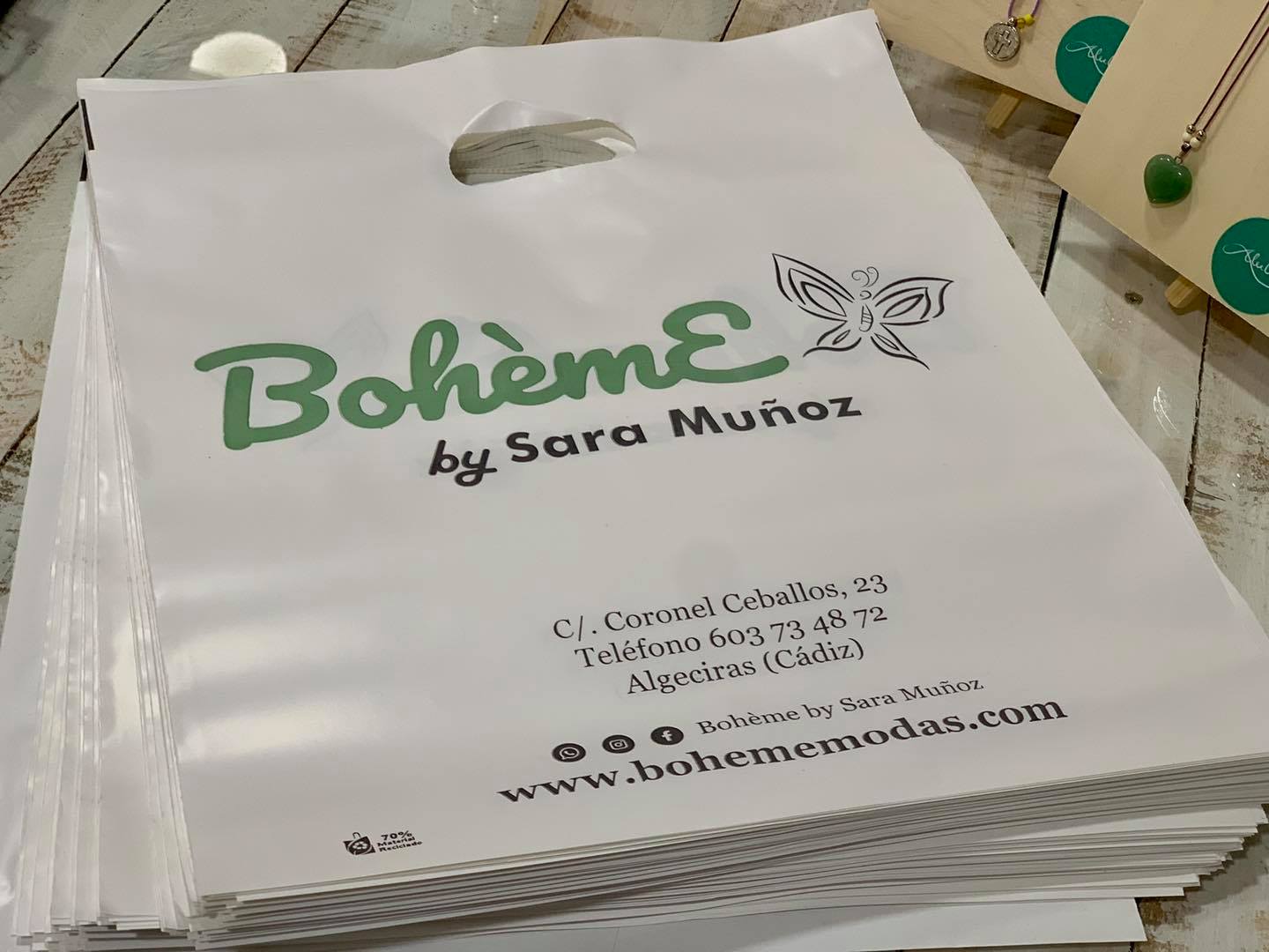 Bolsa de plástico con 70% de material reciclado para Bohème by Sara Muñoz