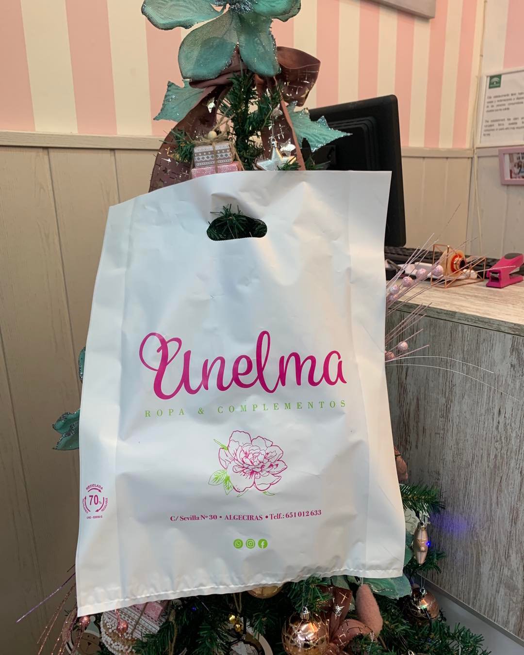 Hemos preparado esta bolsa de plástico con 70% de material reciclado para Unelma Ropa y complementos